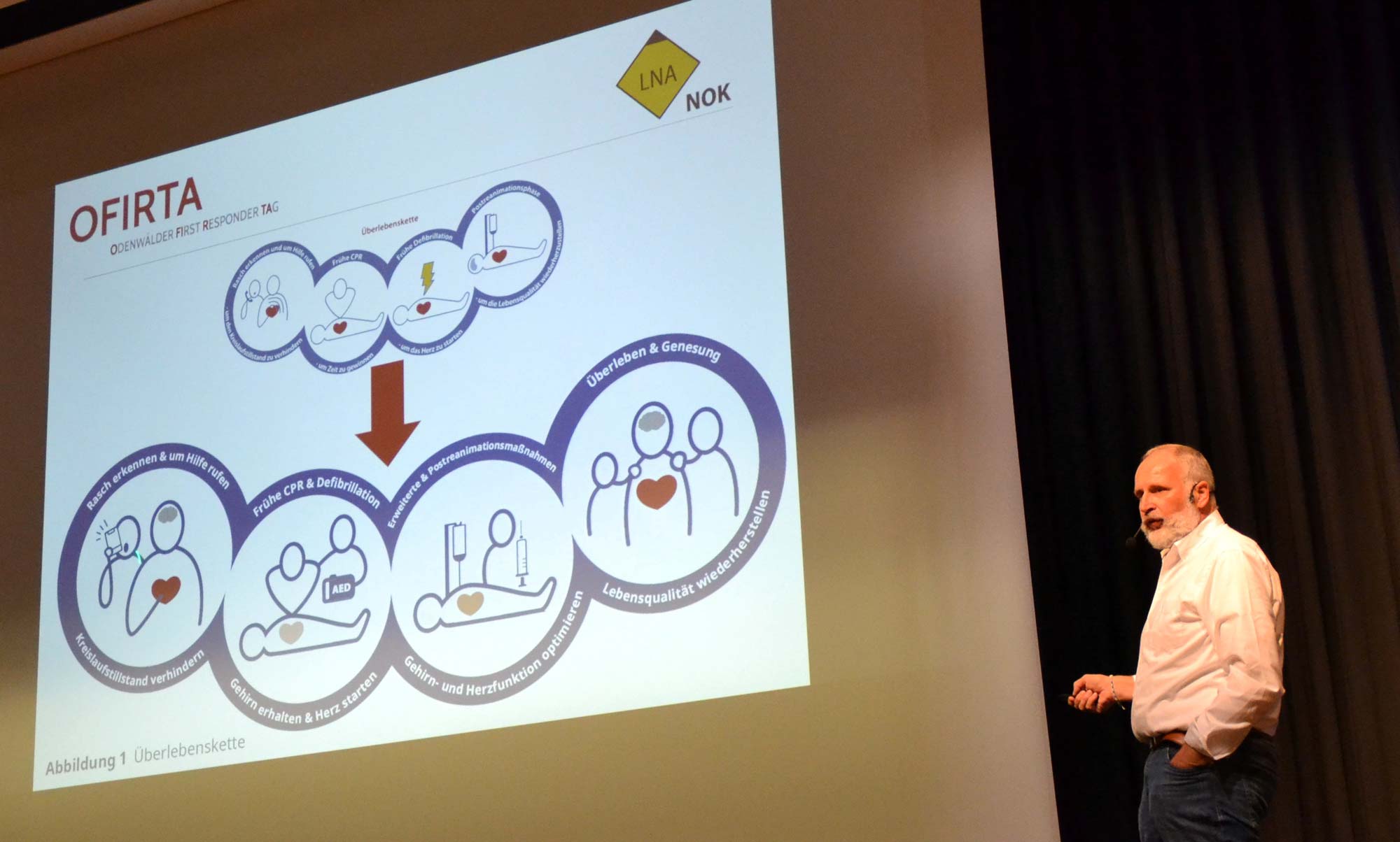 Kurz nach Veröffentlichung der internationalen Empfehlungen zur Reanimation Mitte Oktober widmete sich der mittlerweile 15. OFIRTA – Odenwälder First Responder Tag – schwerpunktmäßig dieser wichtigen Thematik. Die Fortbildungsveranstaltung für ehren- und hauptamtliche Einsatzkräfte aller Organisationen fand im Hybridformat, also einer Kombination von Präsenz und Livestream statt. Die Zahl der Teilnehmer lag dabei mit über 460 aus mehreren Bundesländern deutlich höher als im Vorjahr, wobei über 170 vor Ort in der Buchener Stadthalle waren und damit auch eine wichtige Intention der Veranstaltung unterstrichen: den Austausch zwischen allen an der Notfallversorgung Beteiligten zu fördern. Rund um die Uhr sind First Responder, also qualifizierte Ersthelfer oder „Helfer vor Ort“ (HvO), in ihren Gemeinden ehrenamtlich einsatzbereit, um die Zeit bis zum Eintreffen des Rettungsdienstes zu überbrücken. Für diese wichtigen Ersthelfer organisieren die Leitenden Notärzte in Kooperation mit dem Förderverein psychosoziale Notfallversorgung (PSNV) im Neckar-Odenwald-Kreis die jährliche Fortbildung. Vorrangige Zielsetzung der Veranstaltung ist es, durch gemeinsames Lernen und den Austausch zwischen verschiedenen Fachdiensten die Zusammenarbeit im Notfallgeschehen immer weiter zu optimieren. Dank der Unterstützung von Sponsoren kann diese Veranstaltung seit der ersten Auflage im Jahr 2011 kostenlos angeboten werden.